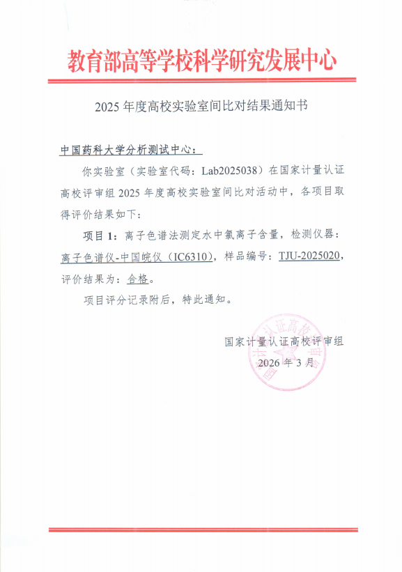 2025年度高校实验室间比对结果于3月公布,我校分析测试中心在“离子色谱法测定水中氯离子含量”项目中以92分的优异成绩获得“合格”认定。